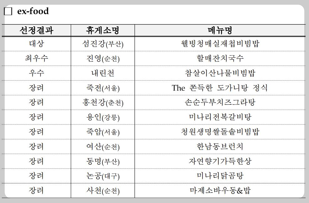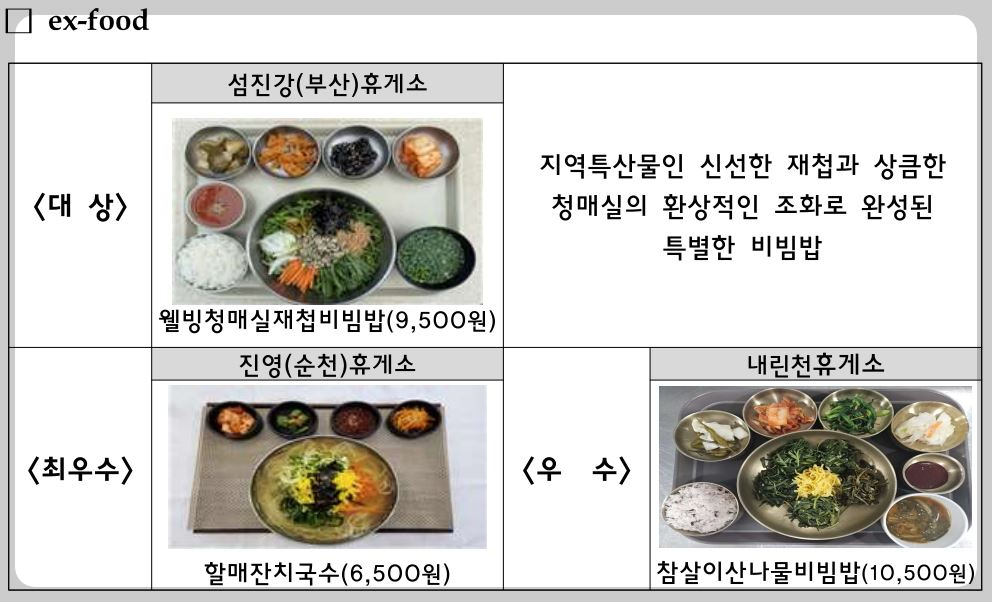 ex-푸드 부문에서는 섬진강 (부산) 휴게소의 웰빙 청매실 재첩비빕밥이 대상을 수상했습니다. 또한 진영 (순천) 휴게소의 할매잔치국수가 최우수상을, 내린천휴게소의 참살이 산나물 비빔밥이 우수상을 각각 차지했습니다.