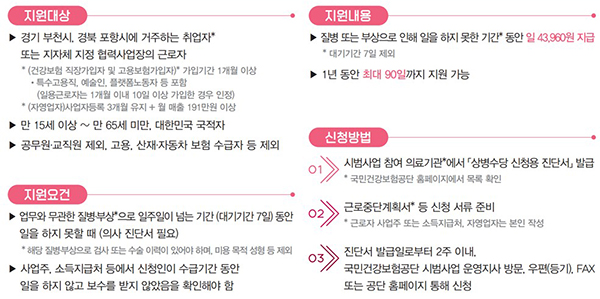 구체적인 부상/질병의 범위 및 요건은 3개의 사업모형에 따라 달리 적용한다. 요건을 충족하는 대상자에게는 급여 지급기간 동안 하루에 올해 최저임금의 60%인 4만 3,960원을 지급한다.